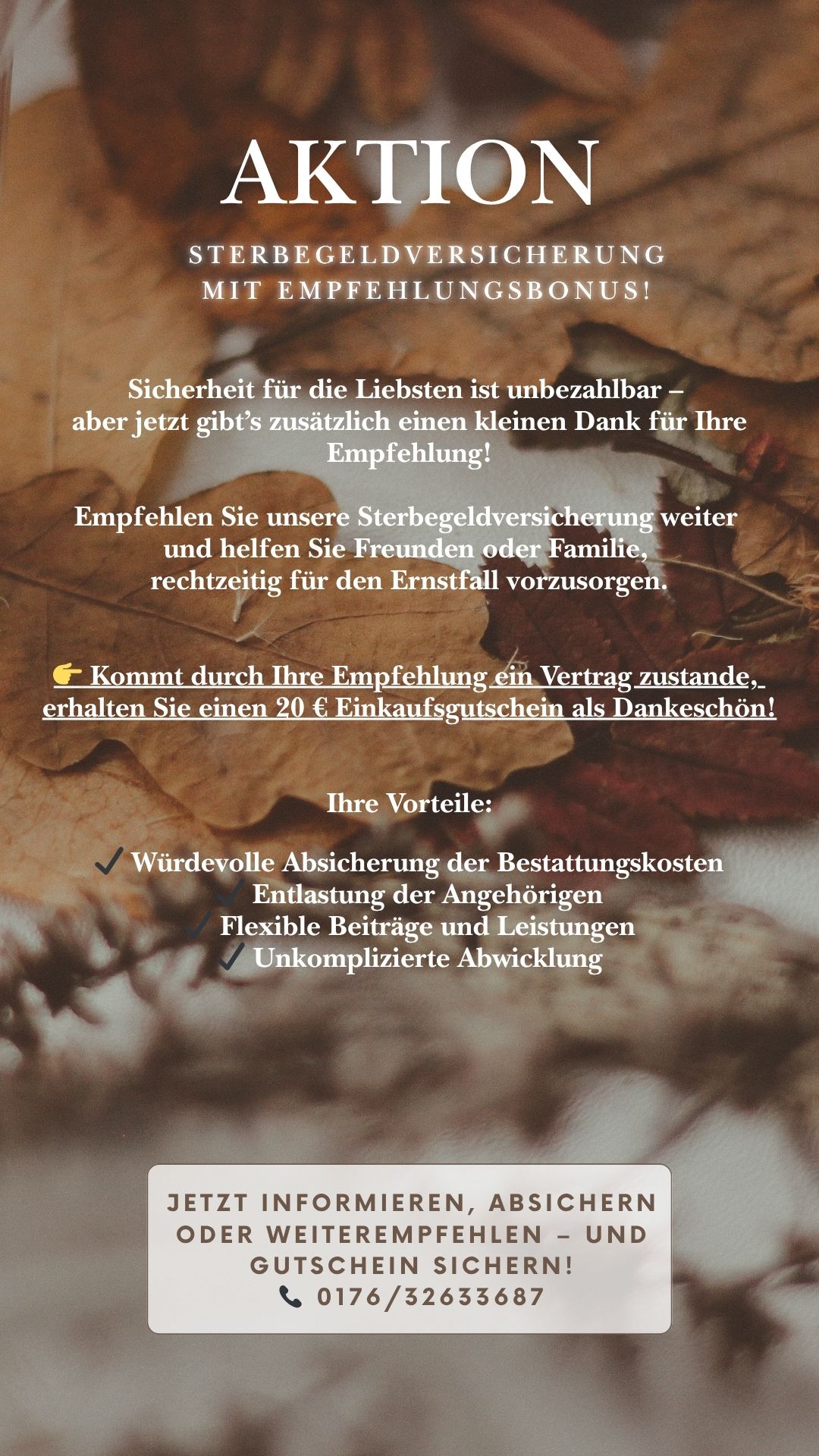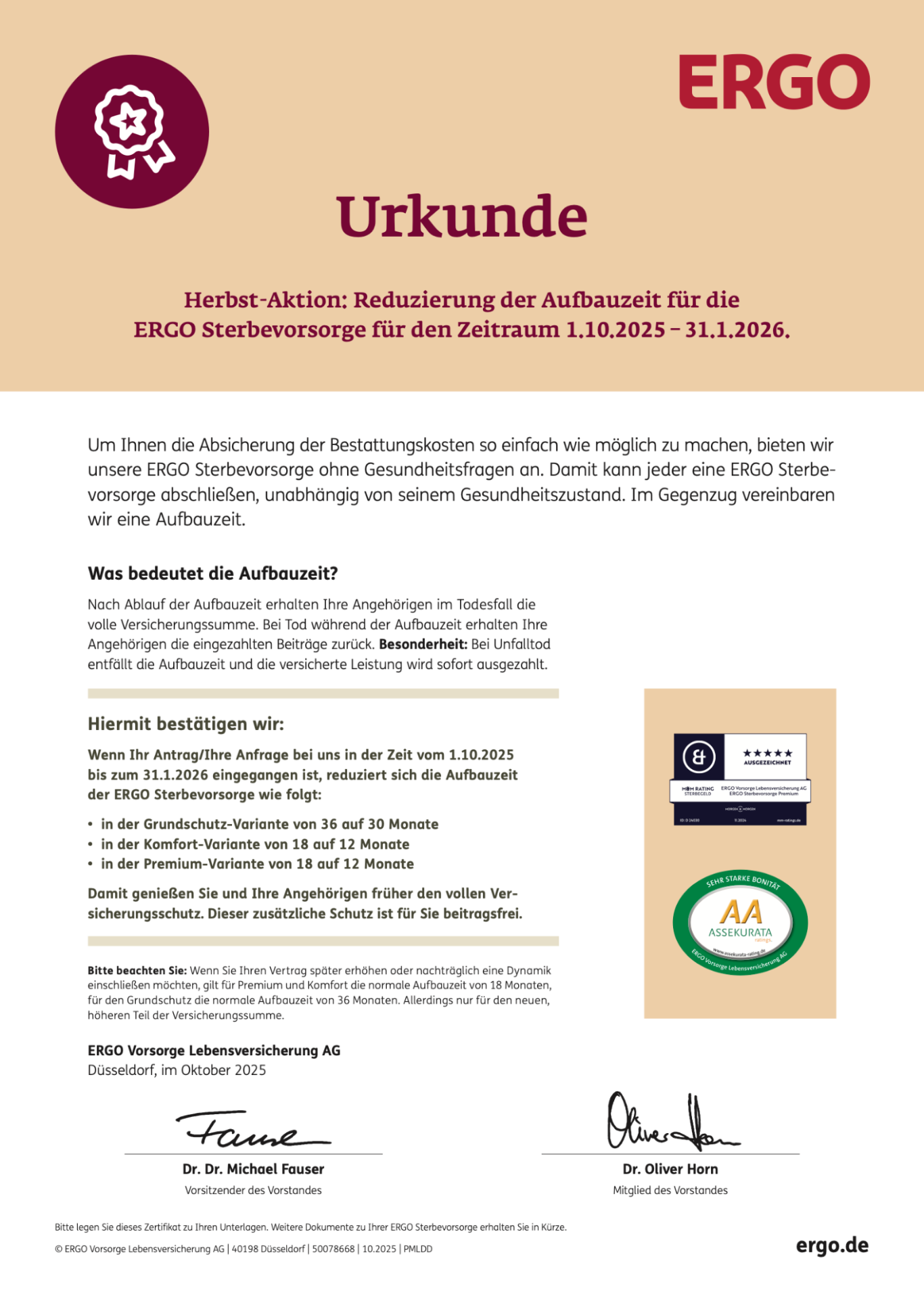 Herbst-Aktion: Reduzierung der Aufbauzeit für die ERGO Sterbevorsorge für den Zeitraum 1.10.2025 – 31.1.2026 und 20,- € Empfehlungsbonus