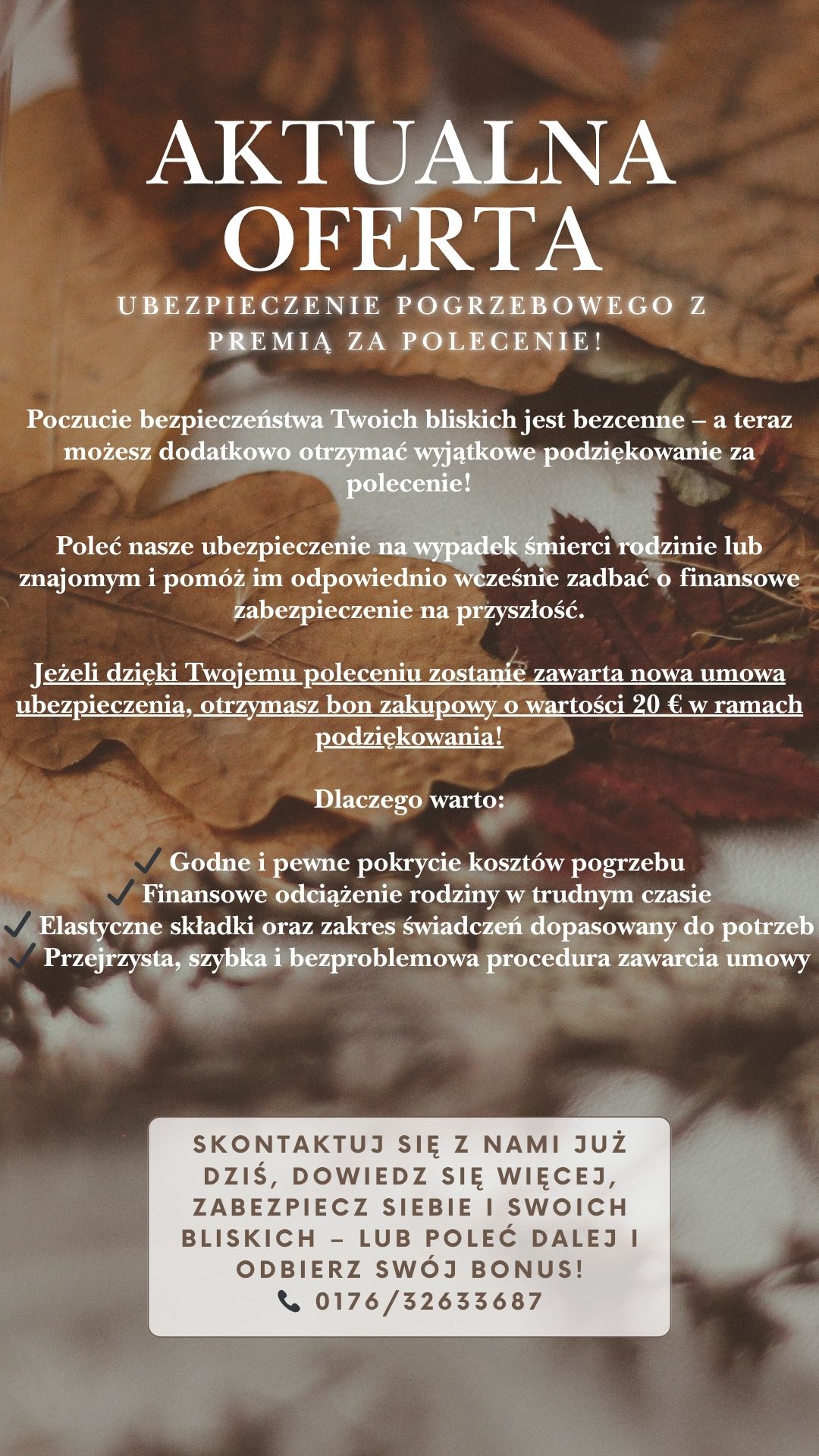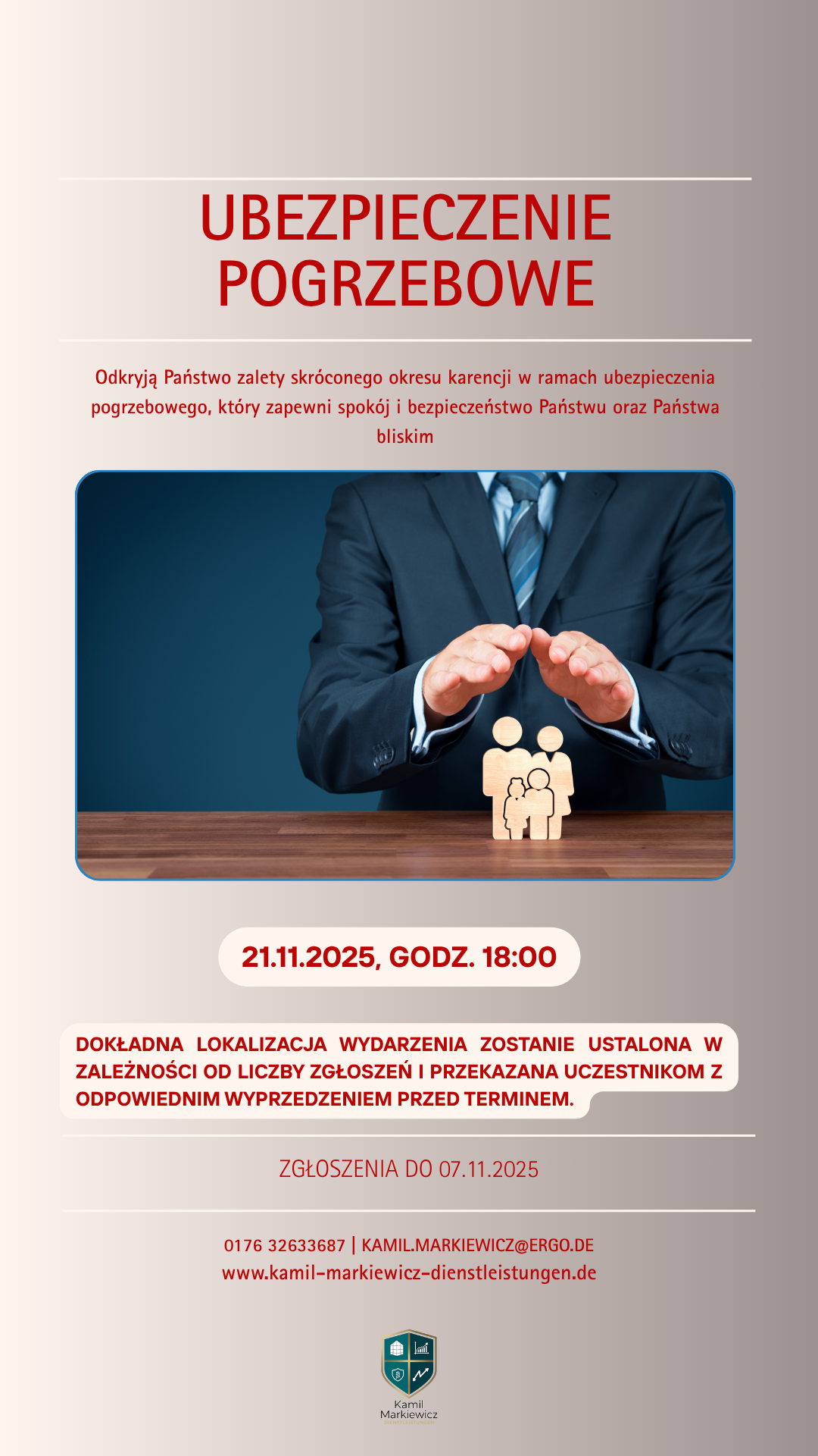 Serdecznie zapraszamy na spotkanie informacyjne poświęcone tematowi „finansowego zabezpieczenia na wypadek śmierci”, które odbędzie się w piątek, 21 listopada 2025 roku, o godzinie 18:00 w Kevelaer.